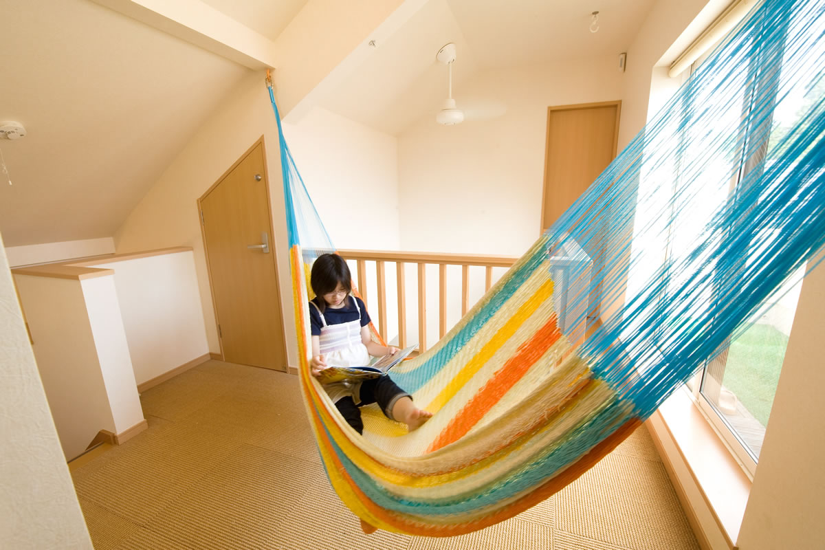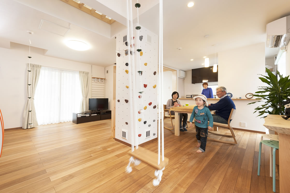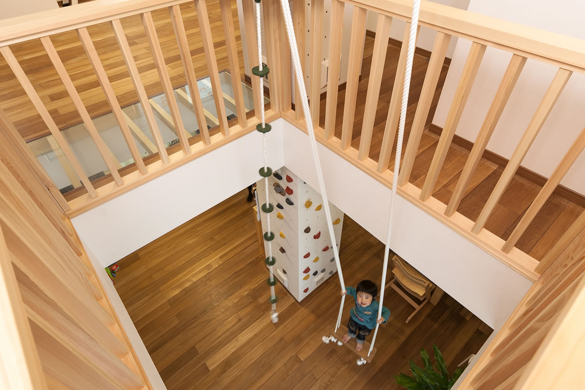 LDKも子供室もHIROBAも開放して家族のストレスが発散出切る様にすることが奥様の理想でした。思い切って、大きな吹抜に振り子の様な長いブランコ、ボルタリング、HIROBAにターザンロープやハンモック、そして回廊を設けたところ、家族の元気な声がこだまして笑い顔がたえません。