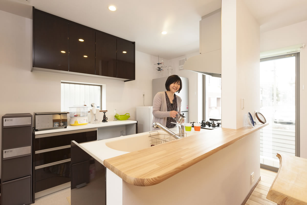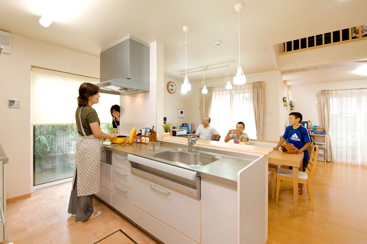 このキッチンスタイルは、家族の会話が飛び交いながら気分良くお手伝いが出来るので、とても喜ばれています。