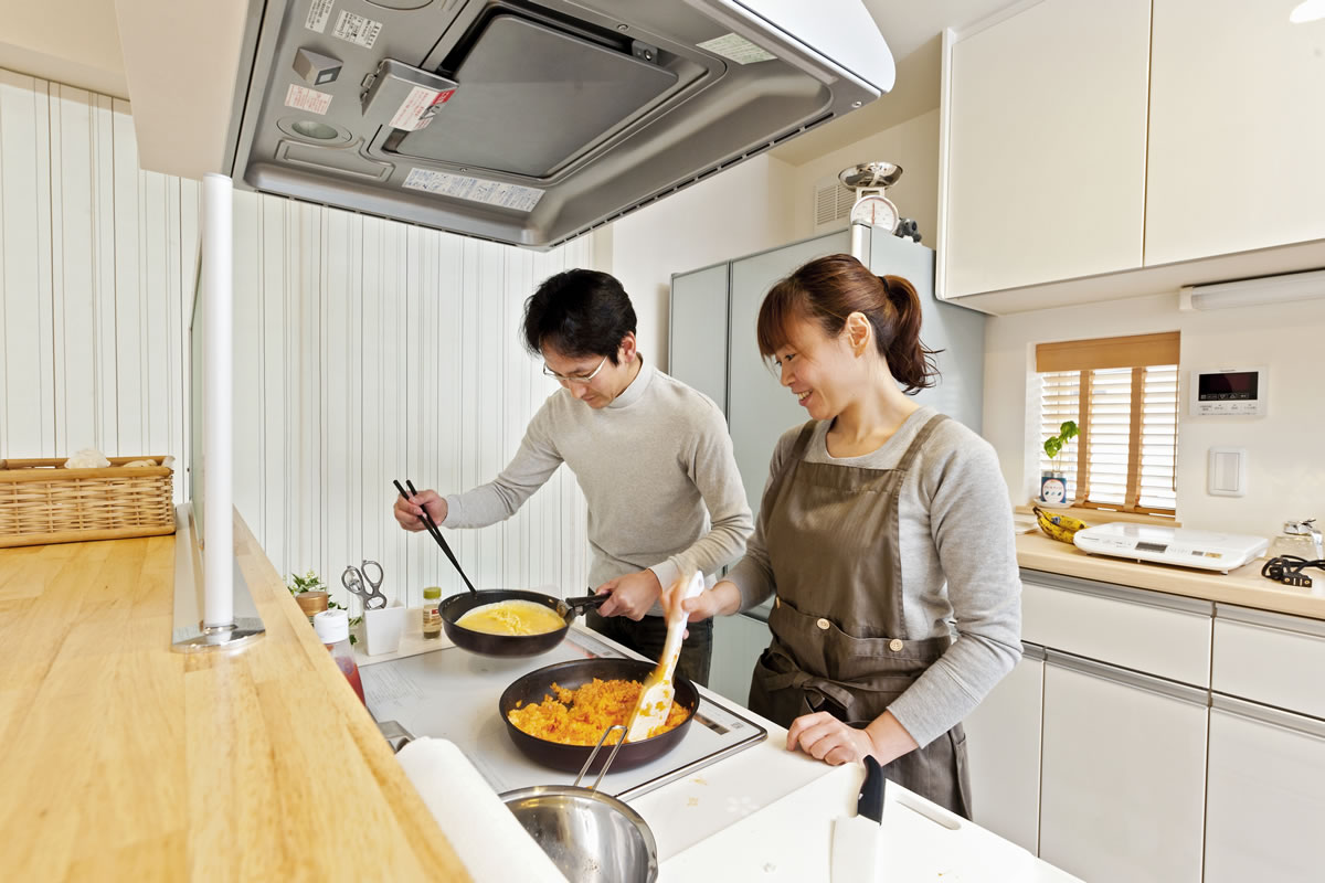 食事の準備から片付けまでを家族皆で楽しむことが奥様の理想でした。思い切って回遊型オープンキッチンにしたところ、ワイワイガヤガヤみんなが参加のにぎやかタイムとなりました。