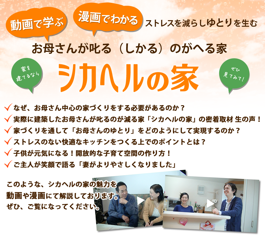 あっ、そうだ!そうだな~、と思われたあなたには、お母さんのストレスが解消される工夫がいっぱいの家、お母さんが叱る(しかる)のがへる家、シカヘルの家を、6話(予定)にわたってお送り致します。