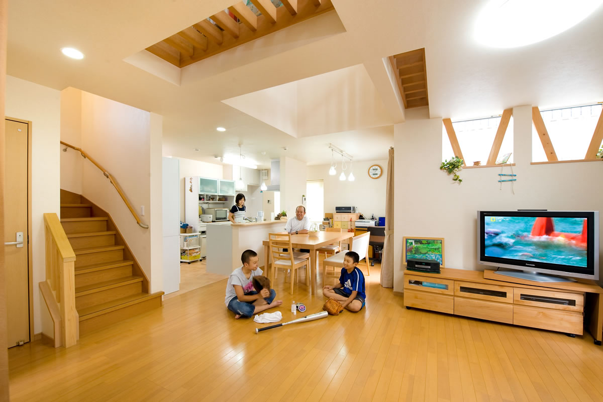 40年以上家づくりに携わって、いつも思い確信しているのは、家の中は全くの別世界、自由で勝手で、伸び伸び出来るすばらしく楽しい世界であること、そして、大っきな太陽となり、周囲を明るくしている「この家の中心はお母さん」であることです。