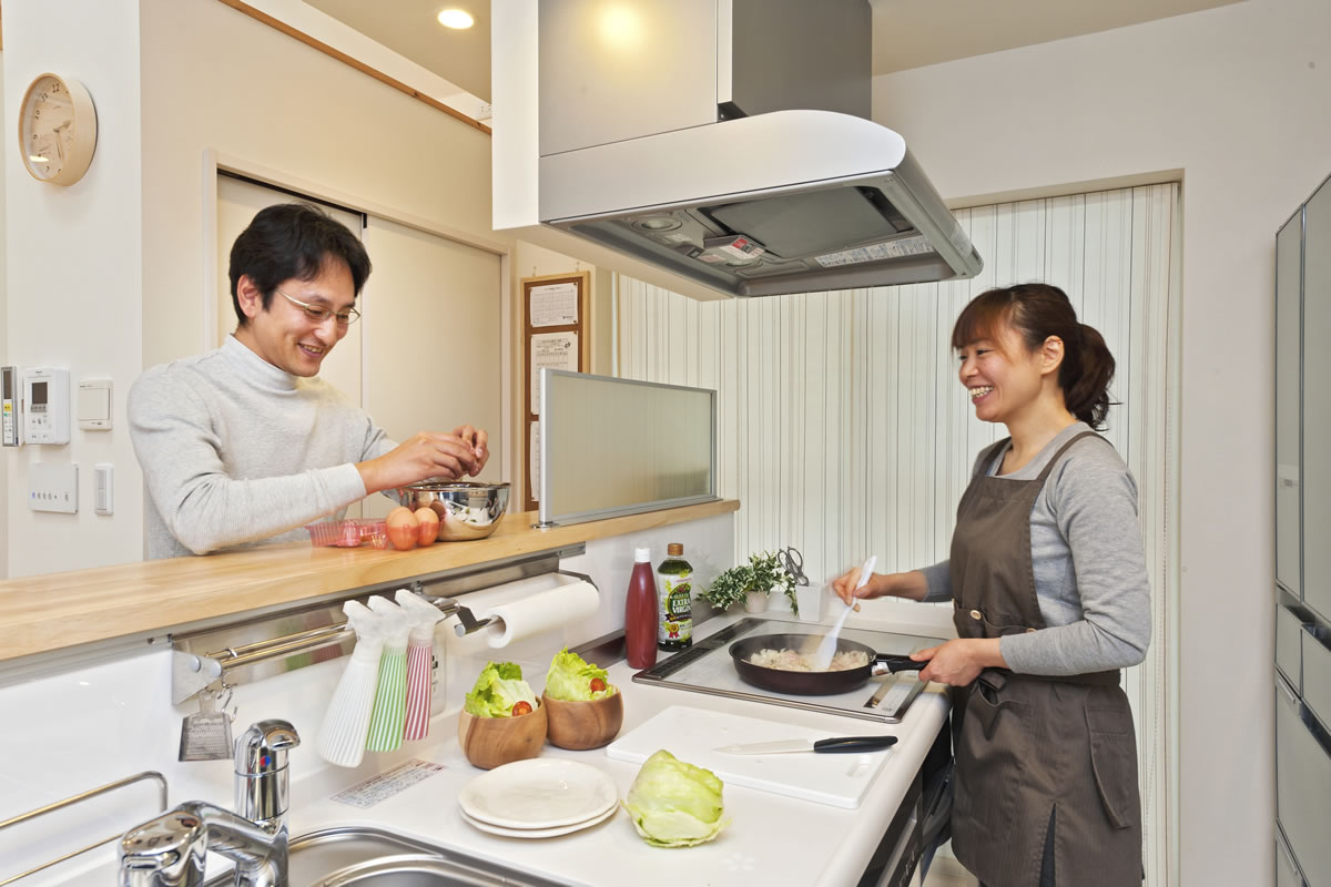 このキッチンスタイルは、家族の会話が飛び交いながら気分良くお手伝いが出来るので、とても喜ばれています。