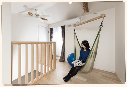 LDKも子供室もHIROBAも開放して家族のストレスが発散出切る様にすることが奥様の理想でした。思い切って、大きな吹抜に振り子の様な長いブランコ、ボルタリング、HIROBAにターザンロープやハンモック、そして回廊を設けたところ、家族の元気な声がこだまして笑い顔がたえません。