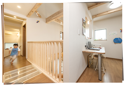 もう1つは、2階へハシゴで登って別の階段から降りてくるとか、子ども部屋のロフトへ登って隣のお兄ちゃんのロフトに行ってハシゴで降りるとか、他にも、ブランコ、登り棒、ターザンロープ、滑り台を使ってクルクル回れるプランにしますと、子供たちは大喜びです。