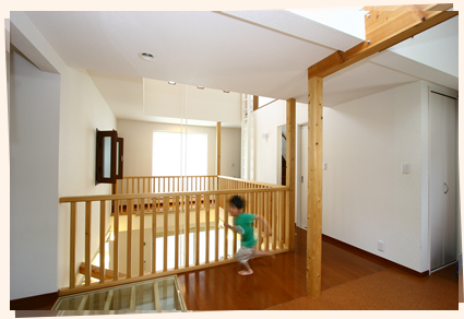 例えば、吹き抜けの廻りを廊下にして、または廊下に続けて遊びコーナー(HIROBAと呼んでいます)とか図書コーナーを付けて、または廊下に続けて、あっち側とこっち側に扉が付いた子ども室を設けて、クルクル廻れる回廊とします。